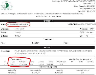 Ocorre que essa empresa, assim como o ex-prefeito da propina na cueca, estão sendo processados pelo Ministério Público de Bayeux por improbidade administrativa.