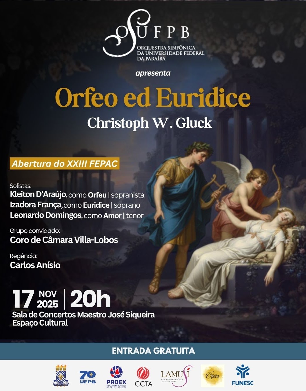Segundo a assessoria da OSUFPB, a orquestra executará parte da Ópera “Orfeo ed Euridice”, do compositor alemão Christoph W. Gluck (1714 – 1787) e contará com a participação da soprano Izadora França, do contratenor Kleiton D’Araújo, do tenor Leonardo Domingos e do Coro de Câmara Villa-Lobos. Já a regência será do maestro e professor de Música do CCTA, Carlos Anísio.