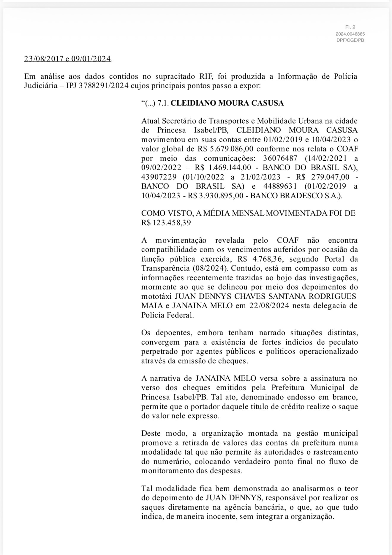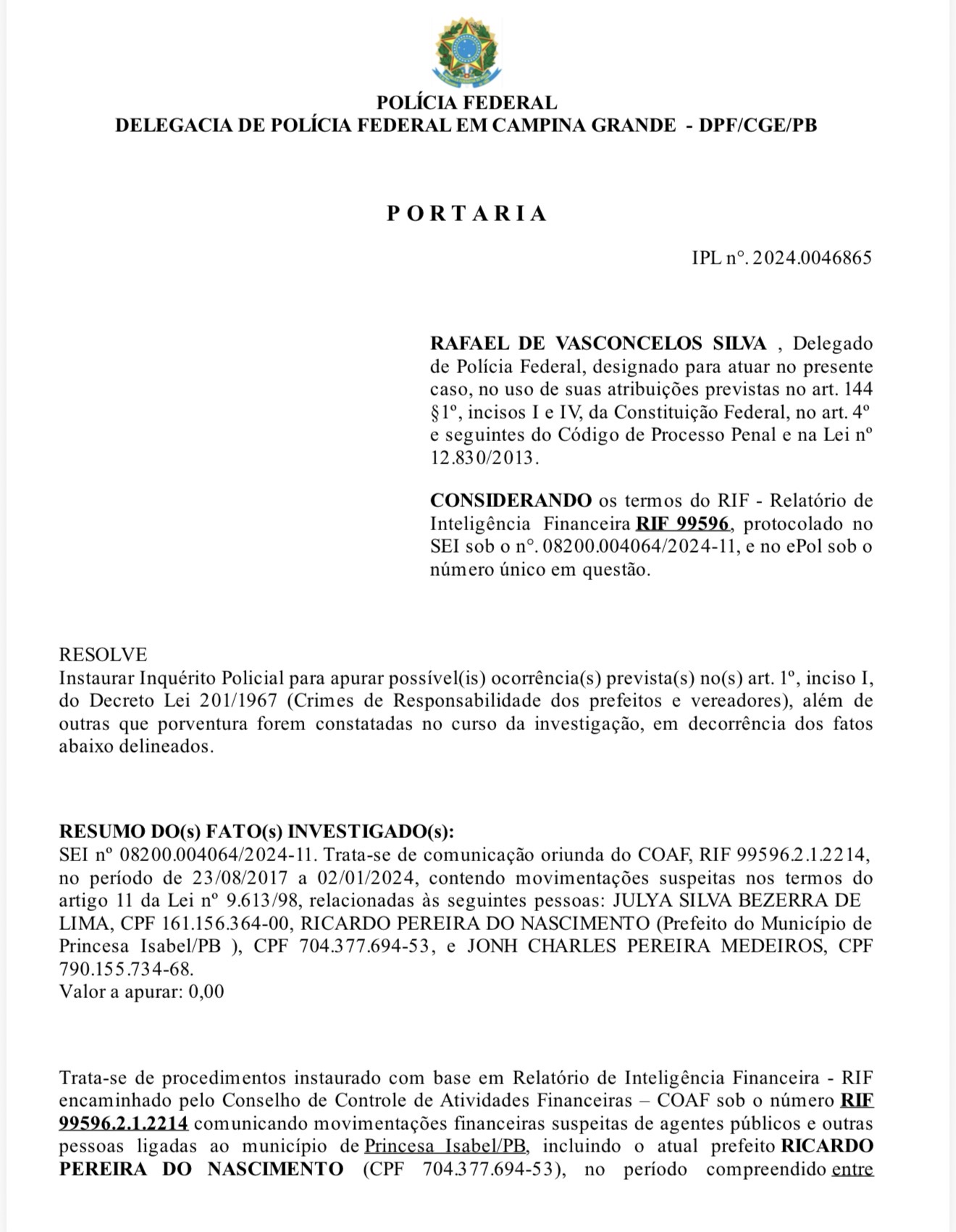 A Polícia Federal instaurou um inquérito para apurar suspeitas de desvio de recursos públicos na Prefeitura de Princesa Isabel durante a gestão do então prefeito Ricardo Pereira. A investigação aponta movimentações financeiras consideradas incompatíveis com a renda de servidores, saques em espécie, endossos de cheques e operações que, segundo a PF, podem caracterizar um esquema estruturado para dificultar o rastreamento de despesas do município.