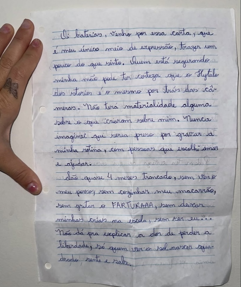 Na carta, o criador de conteúdo descreve o impacto emocional dos quase quatro meses atrás das grades e afirma que jamais imaginou passar por essa situação.