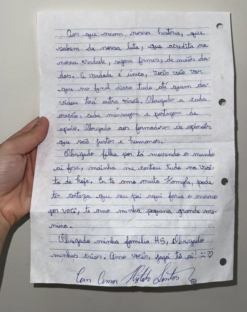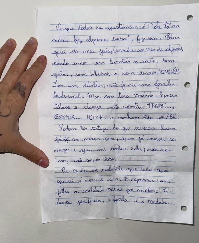 Hytalo Santos, preso preventivamente em João Pessoa (PB) desde agosto, fez uma carta aberta escrita à mão na qual relata a rotina no presídio e volta a negar as acusações de exploração de menores. O texto foi compartilhado neste domingo (7/12) por Kamylinha, apontada como uma das menores de idade exploradas pelo influenciador.