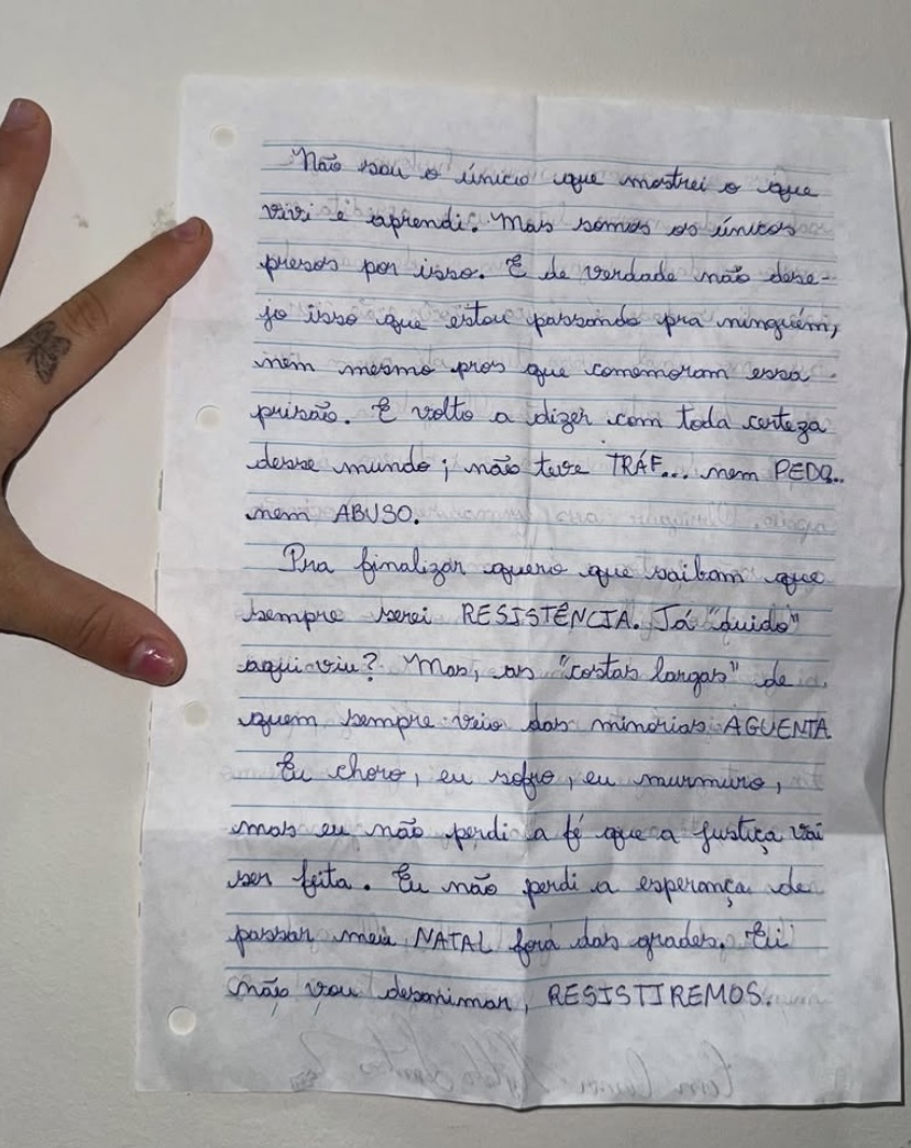 Ele encerra a carta dizendo que se mantém confiante em uma decisão judicial favorável. “Eu choro, eu sofro, eu murmuro, mas eu não perdi a fé até que a Justiça seja feita. Eu não perdi a esperança de passar meu Natal fora das grades, não vou desanimar, resistiremos”, concluiu.